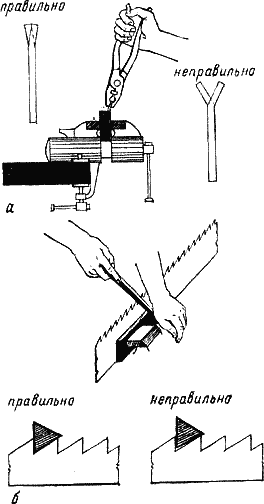 Зубья разводят, то есть отгибают в разные стороны, чтобы полотно не заедало в пропиле. Обычно пилы поступают в продажу с уже разведенными зубьями. Но не исключено, что вам достанется пила без развода. Тогда придется развести зубья самому. Для этого закрепите с помощью деревянной прокладки полотно в тисках и плоскогубцами начните осторожно отводить верхушки зубьев поочередно то в одну, то в другую сторону (рис. 9, а). Отводите верх зуба не больше чем на половину толщины полотна. Более широкий развод может лишь повредить, так как пропил получится чересчур широким и неровным. Следите за тем, чтобы развод у всех зубьев был одинаковым. Иначе в пилении будут участвовать не все зубья, а только наиболее отогнутые, и пилить такой пилой будет трудно.