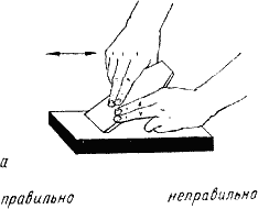Сначала затачивайте нож на бруске, закрепив брусок в деревянной оправе или в выемке на рабочем столе. Затачивать нужно, проводя нижней скошенной гранью ножа (фаской) по камню. Держите нож правой рукой, а левой нажимайте на него при движении от себя (рис. 10, а, б). Следите за тем, чтобы во время движения ножа но бруску фаска прилегала к камню всей плоскостью, и не меняйте угла наклона ножа. Иначе фаска превратится из плоской в горбатую, ширина фаски станет неодинаковой, и строгать такой нож будет плохо. Конечно, держать нож под одним и тем же углом при скольжении его по камню непросто. Нужна сноровка. Потренируйтесь, и вы ее приобретете.