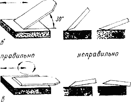Своевременно обнаруженный перекос можно устранить, сточив сначала более высокую часть кромки, а затем выровнив остальную (рис. 11, б). Для стачивания нужно отклонить нож в сторону, противоположную той, при которой возник перекос, а для выравнивания – перемещать нож строго перпендикулярно режущей кромке.