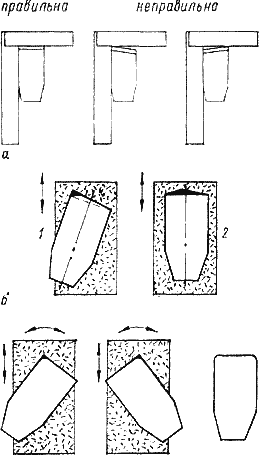 После удаления заусенца произведите правку заточенного лезвия на оселке. Для этого нужно слегка смочить оселок водой и круговыми движениями провести им сначала по фаске, затем по передней грани и снова по фаске. Во время заточки ножа рубанка проверяйте угольником, не перекошена ли режущая кромка (рис. 11, а). Даже малейший перекос недопустим. Иначе вы намучаетесь при строгании. Стружка будет сминаться, забивать просвет между ножом и колодкой, и ее придется то и дело выколачивать. Перекос режущей кромки может быть результатом производственного брака или же возникнуть при заточке из-за неправильного положения ножа.