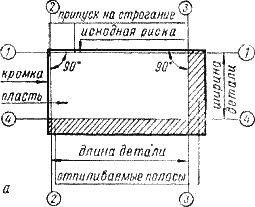 Перед разметкой внимательно осмотрите плиту и решите, какие края отпилить. Кроме того, по внешнему виду плиты определите, какая сторона (пласть) будет лицевой (наружной), а какая оборотной (виутренней). Для получения той или иной плоской детали в большинстве случаев достаточно отпилить от плиты только две крайние полосы (продольную и поперечную) с таким расчетом, чтобы на эти полосы попали по возможности самые крупные дефекты. Но разметку в любом случае нужно сделать по всему контуру, чтобы после распиливания не делать новой разметки для строгания.