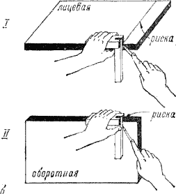 Но зачем нужно переносить разметку на оборотную сторону? Нельзя ли ограничиться разметкой одной лицевой стороны? Нет, нельзя. И вот почему. Во время пиления возможен перекос и увод пилы за риску, что особенно часто наблюдается у новичков. И если нет контрольной, разметки на обороте, то своевременно проверить правильность распила просто невозможно. А неправильный распил приводит к заужению или укорочению детали и, следовательно, к ее порче.