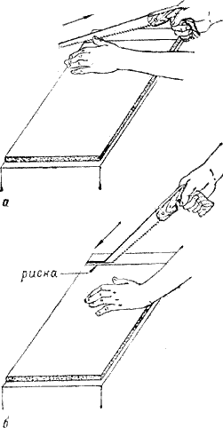 Пиление начните с неглубокого запила легким коротким движением пилы на себя. А для того чтобы пила при этом не соскользнула с места запила, полотно пилы направляйте вдоль ногтя или согнутого сустава большого пальца левой руки (рис. 13, а). Делайте это смело, не опасаясь, что порежете палец. Только после того как будет сделан залил, переходите на пиление на полный размах с легким нажимом при движении пилы от себя. При этом постепенно переводите полотно из наклонного положения в положение, близкое перпендикуляру к поверхности плиты (рис. 13, б).