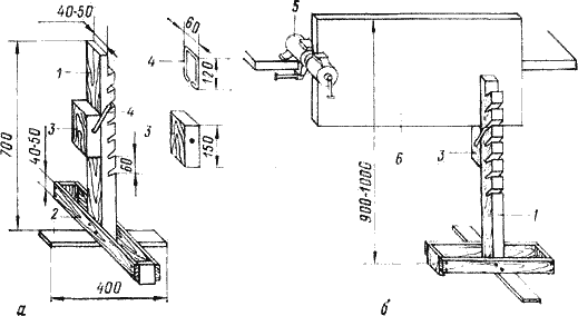 нуждаются в дополнительной опоре. Такой опорой может служить простейшая подставка с переменной высотой опирания (рис. 14, а). Она состоит из установленной на крестовине стойки с косыми зазубринами и перемещаемого по высоте ползуна, который с помощью проволочной скобы может удерживаться на уровне любой зазубрины.