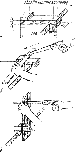 Чтобы удобнее было держать брусок или доску при пилении, изготовьте из отходов брусков простое упорное устройство с двумя накладками (верхней и нижней) по концам (рис. 15, а). Нижняя накладка упирается в крышку стола, а в верхнюю упирается распиливаемая заготовка (рис. 15, б).