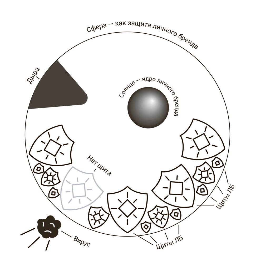 Иммунитет личного брендаЯдро личного бренда (ЛБ) расширяется и растет, обрастает новыми слоями (как наша планета) по мере роста значимости ЛБ. Сфера – защитный слой. Щиты – усиление защитного слоя. Каждый щит разный: легенда ЛБ, репутация, коммуникация, активности и т. д. Если щита нет на своем месте, то в него может попасть вирус (любое внешнее воздействие, хейт, альтернативная легенда, «правда»). Тогда в сфере образуется дыра, которая начинает разрушать другие щиты и наносит вред ядру. Если щит старый (неактуальный) или треснул из-за неправильных действий или высказываний, то он тоже разрушается и образует такую же дыру. Она ослабляет иммунитет ЛБ, начинает болеть весь организм и остальные здоровые щиты. Если от внешнего воздействия пострадали некоторые щиты, то недолго ситуацию может спасать сама сфера. Есть время сформировать новый щит или восстановить старый. Если щита нет, то внешнее воздействие легко пробивает брешь в сфере.