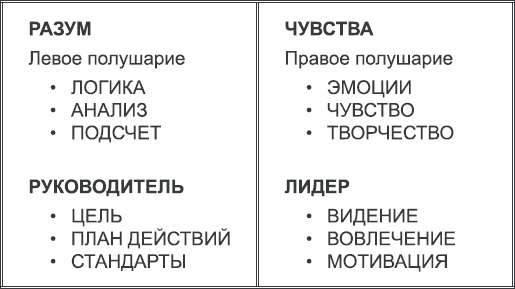 С психофизиологической точки зрения лидер и руководитель представляют собой правое и левое полушария головного мозга.