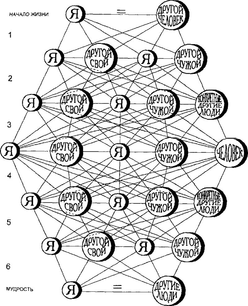 Думается, что в данной схеме можно увидеть главные точки качественного изменения свойств психической реальности. На схеме они отмечены кружками и показывают путь развития индивидуальности через освоение своих новых качеств во взаимодействии с Другими людьми как основы для содержательно иных обобщений в Я-концепции и концепции Другого человека.