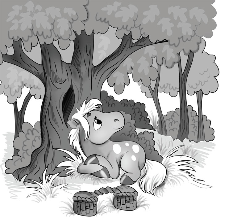 Была и другая причина для грусти: лошадке не нравилось, как она выглядит. Все вокруг твердили, что белые круглые пятна на спине и ногах – это красиво. Но лошадка никому не верила. Когда она приходила к озеру и видела своё отражение в воде, слёзы сами капали из глаз.