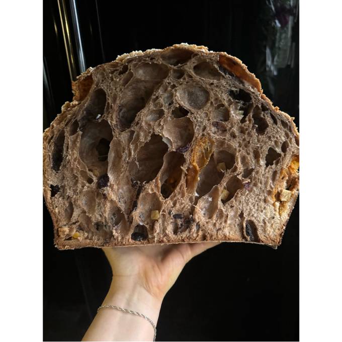 Разделение и округление. Отдых. Тут нечего добавить кроме того, что не все дают отдых заготовкам. Некоторые мастера пропускают округление и отдых и после разделения сразу формуют. Считается, что округление и отдых дают еще больше аэрации тесту, еще больше структуры, и пропуск этого этапа, особенно у новичков, крайне нежелателен, хотя для мастера – это огромная экономия времени, потому что 30-50 минут он экономит. В условиях предновогодней гонки панеттоне – это может быть важным моментом, особенно на производстве. По разделению тоже стоит отметить, что разные мастера предлагают разные варианты: некоторые считают, что в формы нужно закладывать тесто 1:1, другие хотят добавить по 5-10% сверху, (якобы для более высокого подъёма в формах). Новичкам нужно ориентироваться на 100%, то есть если форма на 500 граммов – закладывайте 500 граммов теста, не добавляйте еще проценты – это кажущаяся прибавка не добавит вам роста панеттоне, он все-таки зависит от вашей закваски, а вот вес панеттоне увеличится, и ваши альвеолы, к которым вы так стремитесь – просядут… под весом заготовки. Фото такого примера прилагается! Тут как раз 100%+10% (опять же по методичке наставника). Когда я сделала первые видео этого панеттоне – альвеолы были достаточно выраженными, они казались мне прекрасными на тот момент! А потом я сделала фото для инстаграма, и разглядывая его, поняла, что почему-то альвеолы слегка приплюснулись что ли. Не сразу, но до меня дошла простая физическая истина: они просели под собственным весом. В следующие разы я уже раскладывала по формам 1:1 и результаты стали видимо лучше.