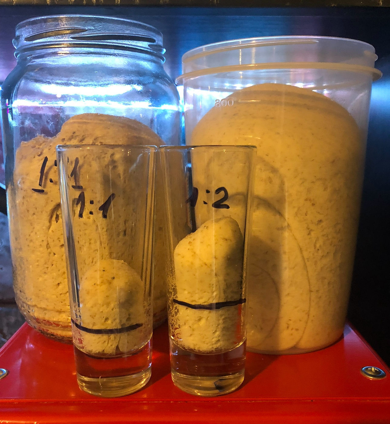 На следующий день возьмите 100 г муки, 100 г закваски и 50 г воды и замесите свою первую 50% Левиту. Оставить на брожение при 24-26°С на 24 часа.