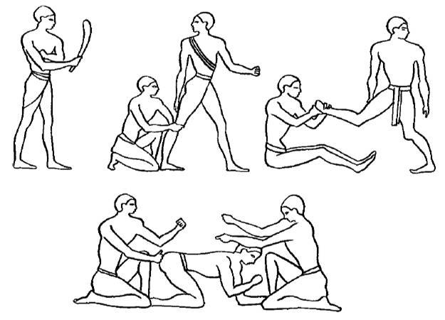 Особой популярностью пользовался лечебный массаж у древних ассирийцев и египтян. Свидетельством этому может служить барельеф, найденный во дворце ассирийского правителя Санхериба, а также обнаруженный в 1841 г. во время раскопок погребения египетского полководца папирус с изображением массажных приемов: поглаживания икроножных мышц, растирания стопы, поколачивания мышц спины и ягодиц (рис. 1).