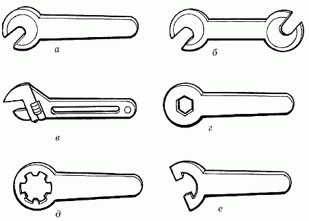 Рис. 2. Виды гаечных ключей: а – односторонний; б – двусторонний; в – разводной; г – накладной; д – накидной закрытый для круглых гаек; е – накидной открытый для круглых гаек