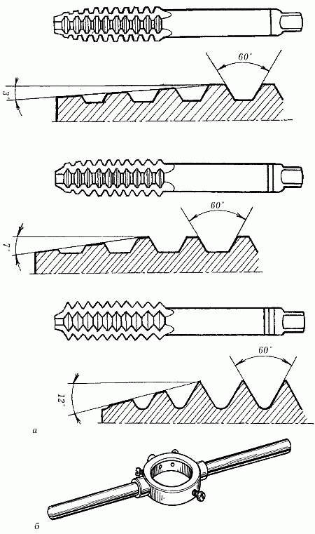 Рис. 4. Инструменты для нарезания внутренней резьбы: а – метчики; б – вороток
