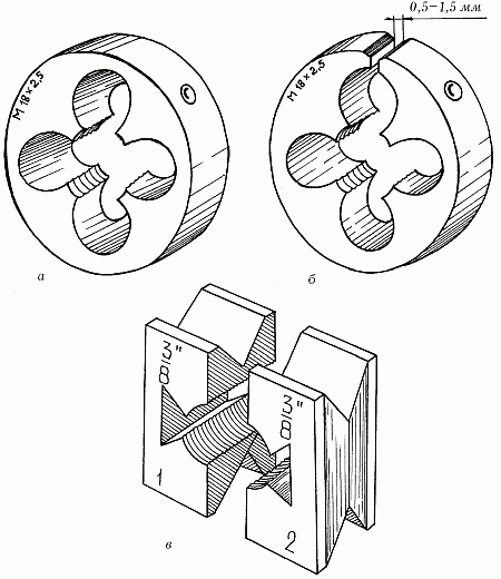 Рис. 6. Плашки: а – круглая цельная; б – круглая разрезная; в – раздвижная
