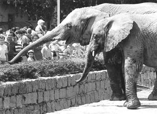 Гржимек был на автомобиле-амфибии, поэтому смог подобраться довольно близко к слоновьему стаду, пьющему воду. Вот как он это описывает: «Несмотря на то что я заблаговременно выключил мотор и подплываю к ним бесшумно, верзилы забеспокоились. Они отступают, топча мягкий прибрежный песок, взволнованно поводят своими огромными ушами и быстро исчезают, ловко взобравшись по поросшему кустарником откосу. Сразу же все стихает, словно их здесь и не было. Но одному самцу, пасшемуся отдельно за песчаной косой, пришлось со мной познакомиться поближе. Он оказался столь легкомысленным, что зашел по мелководью на очень узкую полоску пляжа, за которой поднималась отвесная стена берега, слишком гладкая для того, чтобы по ней мог взобраться даже такой хороший скалолаз, как слон.