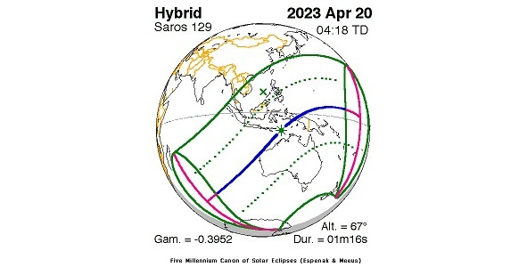 В метоновом цикле это второе затмение в серии из четырех (19.04.2004 – 20.04.2023 – 20.04.2042 – 20.04.2061).