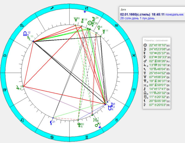Поиск соответствующих описанию астрономических явлений при помощи программы Радикс 6 позволил максимально близко реконструировать гороскоп. Получен следующий результат: 20