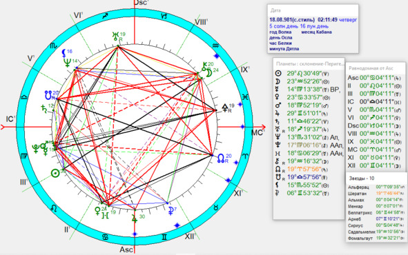: Asc в Раке в соед. с Сириусом, в 1-м доме Юпитер (в самом высоком градусе, т.е. 1° Рака) и Венера (в Раке), и Меркурий – в Деве, Солнце – в знаке Льва, – в Водолее, но в VIII доме, если брать равнодомную систему. См. Рис. 3. 18.08.981 г. ст. ст. 2 час 12 мин. Афшана Марс Луна