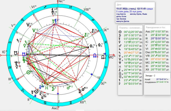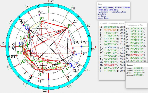 Итак, данные гороскопа: Asc (восходящий знак) в Раке в соединении с Сириусом, в 1-м доме Юпитер (в самом высоком градусе, т.е. 1° Рака) и Венера, и Меркурий – в Деве, Солнце – в знаке Льва, – в Скорпионе. Луна Марс