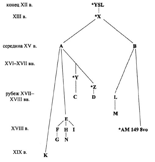 От рубежа XVII–XVIII вв. известны четыре списка – C, D, L и М. К рукописи А восходят рукописи C и D, которые, в свою очередь, являются списками с недошедших рукописей (соответственно *Y и *Z), время создания которых также неизвестно. К рукописи B восходит список L, а его точной копией является список М.