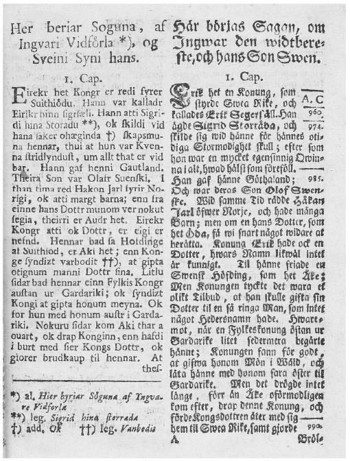 Параллельно в правом столбце опубликован перевод саги на шведский язык, набранный готическим шрифтом. Имена собственные выделены более жирно, чем остальной текст. Как и исландский текст, перевод разбит на главы. Наиболее примечательная черта перевода, опубликованного Н. Брокманом, – это осуществленная им попытка хронологического маркирования событий, описанных в саге. Даты проставлены против конкретных сообщений справа на строках, сокращенных по длине. На первой странице (рис. 3), например, они стоят против упоминания имени Эйрика Победоносного (960 г. – первая дата в тексте), его женитьбы на Сигрид Суровой (974 г.), против сообщения о том, что Эйрик дал ей Гаутланд (985 г.) и т. д. Последняя дата, приведенная Н. Брокманом на полях, – 1060 г. Таким образом, по его мнению, события, описанные в произведении, укладываются в столетний промежуток времени между 960 и 1060 гг. В предисловии, впрочем, не приведено никаких объяснений, на каком основании хронологические рамки выстроены таким образом и приводится та или иная дата.
