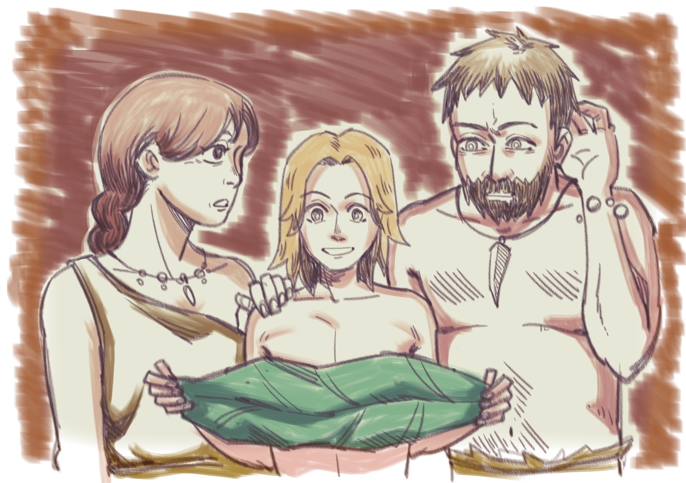 Когда он прибежал к пещере, то увидел разруху. На камне, возле пещеры, сидел его отец Великан, а рядом была мама Великанша и прикладывала ему на рану траву, затем, перевязала куском шкуры.