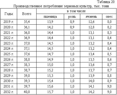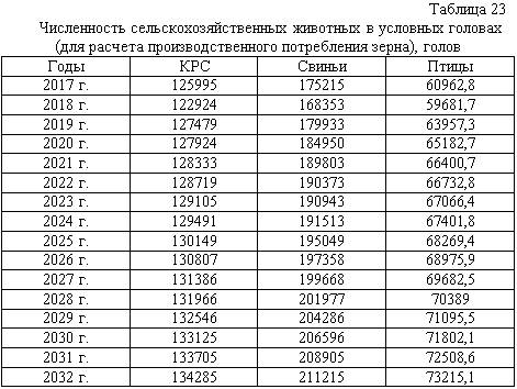 3. Значения производственного потребления на корм скоту и птице всего по зерновым культурам за 2018 г, 2019-2032 гг. определяются путем умножения значений условных голов на 2018 г., 2019-2032 гг. на удельный вес объема производственного потребления на корм скоту и птицы за 2017 г. к численности условного поголовья 2017 г. (49,7%).