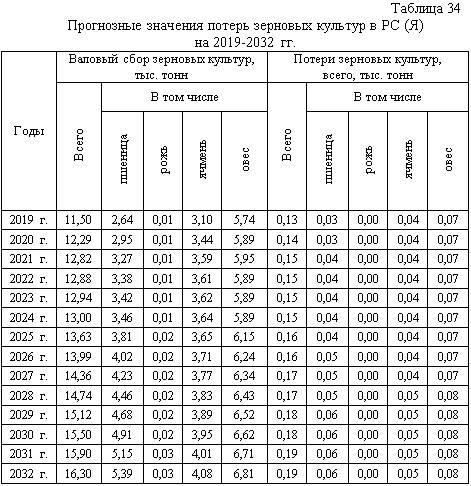 Далее прогнозные значения общего валового сбора всех зерновых культур умножили на среднее значение доли потерь зерна. Таким образом, сформированы прогнозные значения потерь всех зерновых культур (Таблица 34).