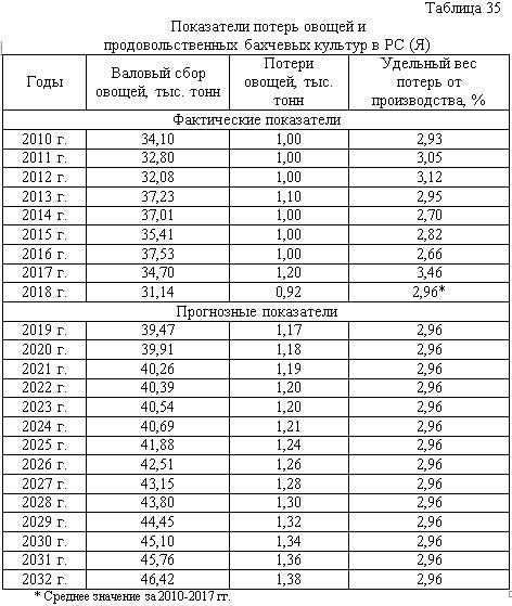Далее для расчета прогнозных значений потерь овощей в РС (Я) на 2019-2032 гг. прогнозные значения производства умножили на среднее значение удельного веса потерь (Таблица 35).