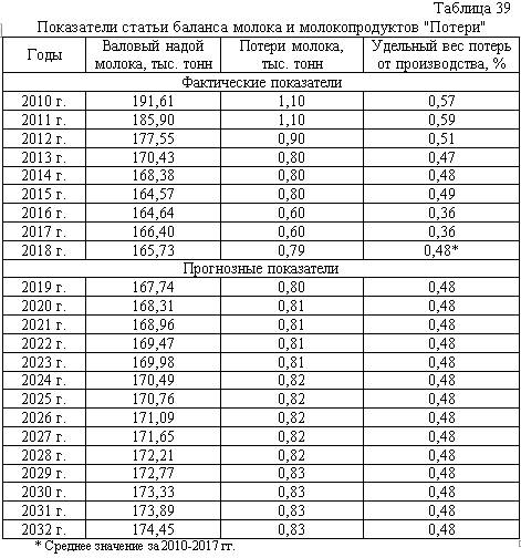 Далее для расчета прогнозных значений потерь молока в РС (Я) на 2019-2032 гг. прогнозные значения производства умножили на среднее значение удельного веса потерь (Таблица 39).