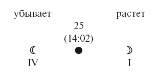 Например, следующий фрагмент, стоящий под какой-либо из таблиц, означает, что Новолуние наступит 25-го числа указанного в самой верхней строке месяца таблицы прохождения Луны через знаки Зодиака в 14 часов 2 минуты московского времени. Римская цифра IV обозначает четвертую фазу Луны (до Новолуния), а цифра I обозначает первую фазу Луны, которая всегда идет сразу после Новолуния. В самой верхней строке указан характер Луны в периоде (растущая от ● до ○ или убывающая от ○ до ●).