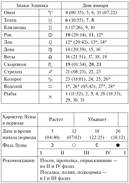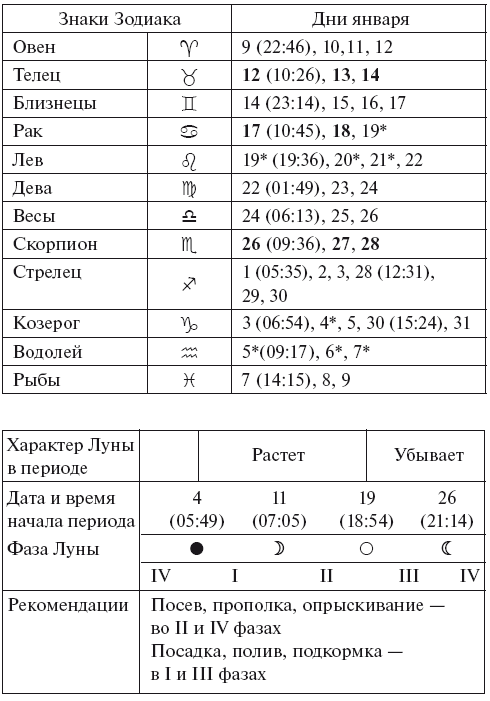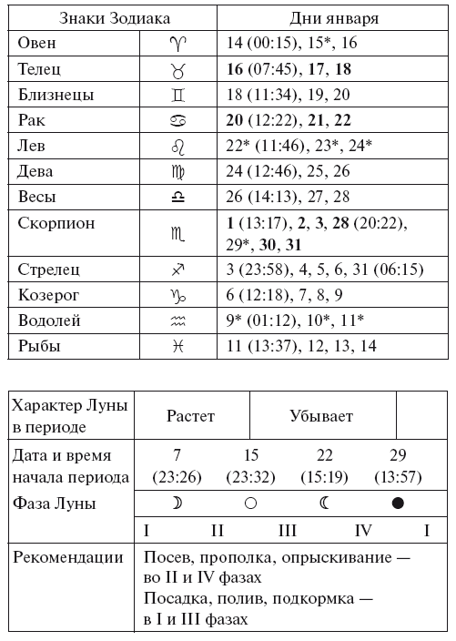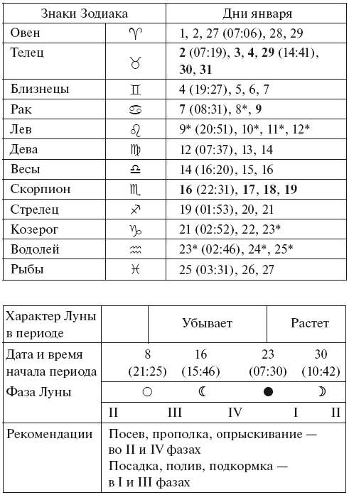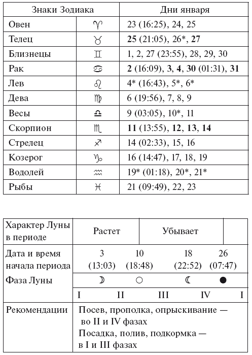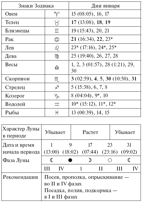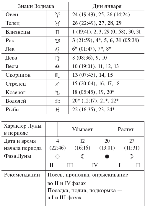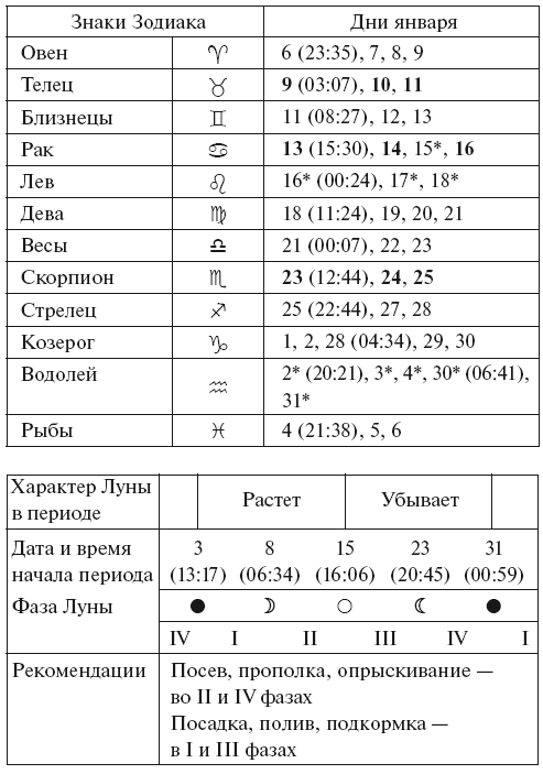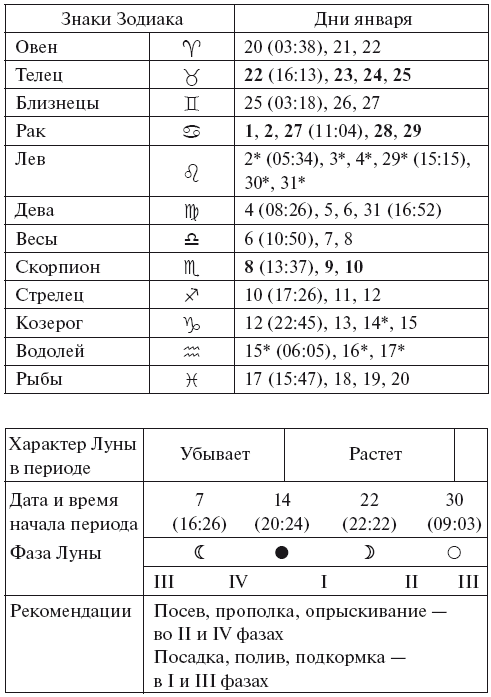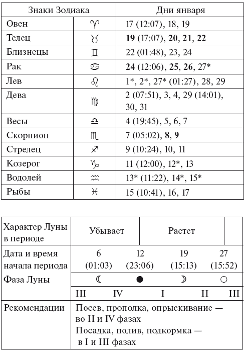 Пользоваться этим календарем просто и удобно. Выбираете подходящий в вашем регионе срок посева или посадок того или иного растения. Смотрите под приведенной таблицей прохождения Луны через знаки Зодиака в нужном вам месяце, в какой именно фазе Луны вы будете сеять либо сажать свои растения. Если следуете знакам Зодиака, то найдите в таблице дни, не отмеченные звездочкой, которые попадают в выбранную вами фазу Луны. Вот они-то и считаются наиболее подходящими. Звездочкой отмечены дни, которые в настоящее время считаются неблагоприятными. Кроме того, звездочкой отмечены дни Новолуния и Полнолуния, а также время за 12 часов перед их наступлением и 12 часов после, поскольку считается, что это неблагоприятное время для работ на огороде и в саду.