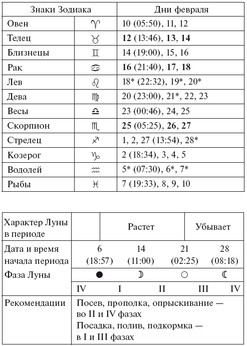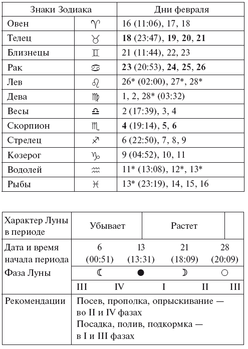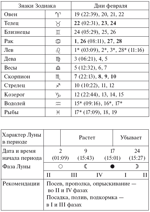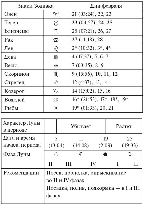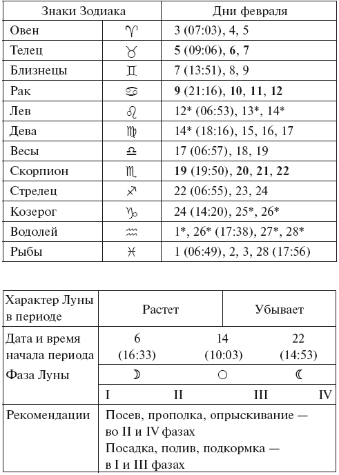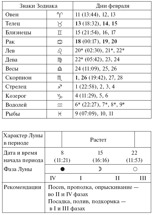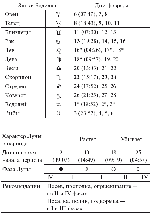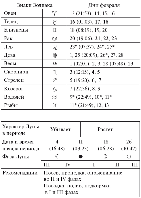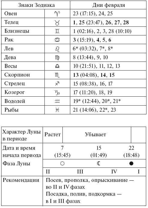 Выделенные полужирным шрифтом дни наиболее благоприятны, отмеченные звездочкой – считаются запрещенными. Остальные дни нейтральные, естественно, их тоже можно использовать для сева и посадок. Дни Льва и Водолея отмечены звездочками. Но для Льва запрет стоит только на огородных растениях. Лев вполне благоприятный знак для садовых растений. А вот дни Водолея считаются непригодными для любых растений. Конечно же, следует согласовать свои работы с климатом в вашей местности. Если у вас обычно идет посев в феврале, марте, то и сеять надо в это время, а если вы живете на севере, то и посев в вашей местности проходит в апреле или мае и даже в июне. Кроме того, в таблицах указано время по Москве, следовательно, стоит учитывать свой часовой пояс.