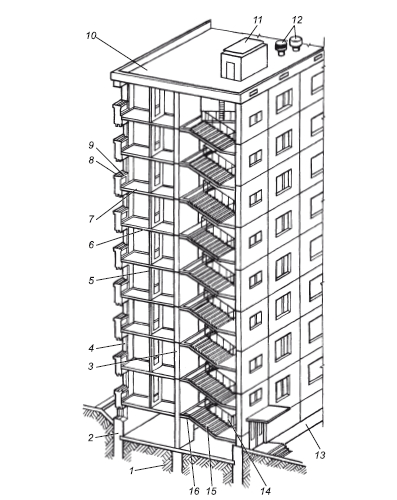 Рис. 1.1. Основные части здания:1 – основание; 2 – фундамент; 3 – стены; 4 – оконный проем; 5 – перегородка; 6 – междуэтажное перекрытие; 7 – пол; 8 – подоконник; 9 – заглушина; 10 – кровельная плита; 11 – вентиляционный канал; 12 – внутренние водостоки; 13 – цоколь; 14 – перила; 15 – лестничный марш; 16 – лестничная площадка