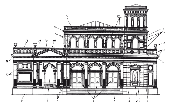 Рис. 1.2. Архитектурные элементы здания:1 – рустованная лопатка; 2 – ниша; 3 – статуя; 4 – русты; 5 – лестница; 6 – двери; 7 – пилястра; 8 – окно; 9 – цоколь; 10 – филенки; 11 – лобовой карниз; 12 – балюстрада; 13 – акротеры (вазы); 14 – аттик; 15 – поле фронтона; 16 – фронтон; 17 – аркада; 18 – раскреповки