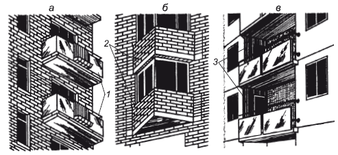 Рис. 1.3. Балкон (а), эркер (б) и лоджия (в):1 – ограждение балкона; 2 – стена эркера; 3 – поперечные стены здания
