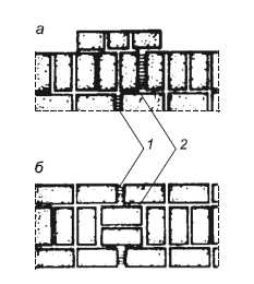 Деформационные швы – это заполненные эластичным материалом вертикальные зазоры, расчленяющие стену. Смежные участки стен (в местах примыкания) сопрягаются «в шпунт» или «в четверть». Такие швы бывают температурными, разрезающими стену от цоколя до карниза, и осадочными, начинающимися от подошвы фундамента и заканчивающимися в карнизе. Деформационные швы предохраняют конструкции стен от появления трещин при перепаде температур и неравномерной осадке зданий (рис. 1.4).