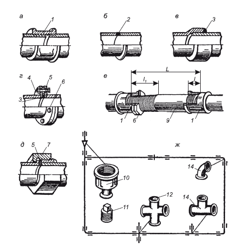 Рис. 3.1. Виды соединений труб и соединительные части: а – резьбовое; б – сварное стыковое; в – сварное враструб; г – фланцевое; д – накидной гайкой; е – соединение со сгоном; ж – соединительные части; 1 – муфта; 2 – сварной шов; 3 – раструб; 4 – фланец, – 5 – уплотнительная прокладка; 6 – болт с гайкой; 7 – накидная гайка; 8 – контргайка; 9 – сгон; 10 – переходная муфта; 11 – пробка; 12 – крест (крестовина); 13 – тройник; 14 – угольник