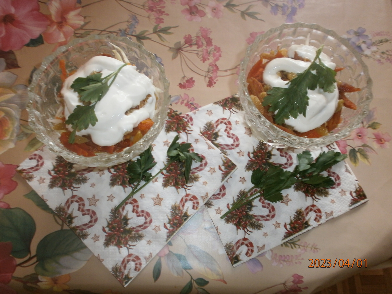 Ингредиенты блюда: капуста белокочанная 100 г, сок лимона 10 мл, сметана 2 ст.л., цедра лимона 2 г, зелень 5 г, курага 40 г, морковь 100 г, изюм 30г.