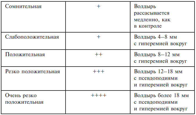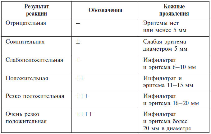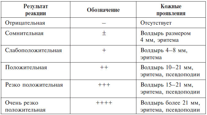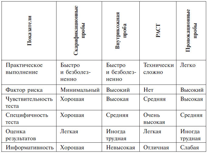 Внутрикожные пробы могут быть отрицательными в связи со сниженной чувствительностью кожи, об этом свидетельствует слабоположительная проба с гистамином. Пробы могут быть ложноположительными в связи с повышенной чувствительностью к консервантам.