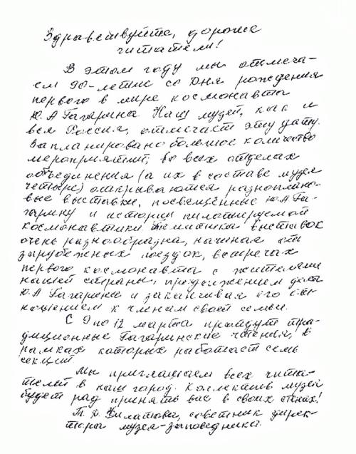 В нашем городе каждый год в День космонавтики, двенадцатого апреля, проходят Гагаринские старты. На Красной площади собираются люди от мала до велика и бегут в село Клушино, за двадцать километров. Туда, где родился наш Гагарин. Чтобы отдать дань уважения, поклониться этим местам, по заведённой традиции отведать воды из колодца, побывать в доме-музее, увидеть стол, за которым когда-то делал уроки Юра Гагарин, причём сидел он не на мягком стуле, как мы сейчас, а на деревянной скамье, писал чернилами, приготовленными из молока и печной сажи. Как это всё удивительно! Ты будто перемещаешься в те далёкие времена. Вдыхаешь неповторимую атмосферу…