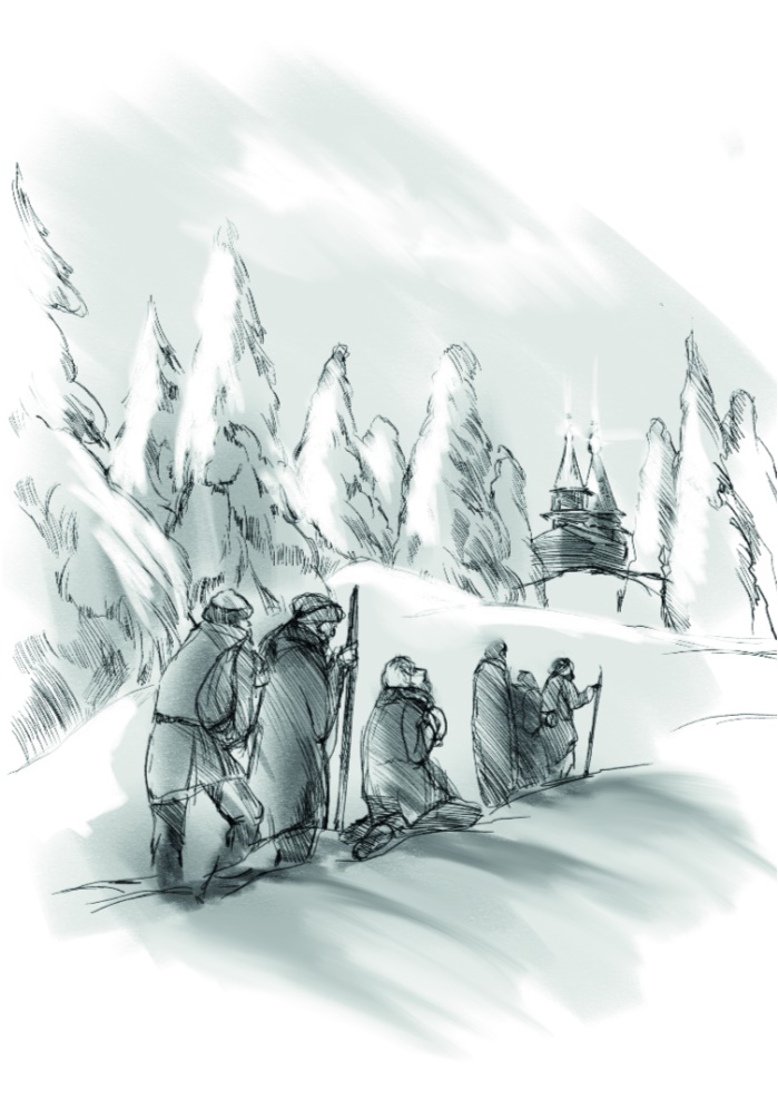 В снегу пустырь.Рябина мёрзлая. За ней,За гранью падеры церквушка с куполами,Как поводырьНа минном поле судных днейДля тех, чей дух телесный скован кандалами.Опаслив шагИдущих сзади след во след.От ягод давленых он будто бы кровавый.Во мгле душа,Но уже виден силуэтИ лик серебряный с лазоревой оправой.Болят ступни,Их обдирает снежный наст,И кровь людская, как водица, в жилах стынет.Злой дух на нихНабросил дьявольскую снасть,Прельщая благами в заснеженной пустыне.Нужды вкусив,Но искушений не приняв,Непосрамлёнными брели простолюдины.Не попросивПощад и истину поняв,Что человек живуч не хлебушком единым.Сума пуста,И лопотина вся из дыр,Душа заблудшая и вера-голодранка.Но неспростаИх вёл незримый поводырьНа блеск церквей, как свет во тьме от сердца Данко.Что жизнь? Стезя,Где обитает плоть и дух.Поди пойми, кто из них щедр и кто убогий…Познать нельзяБез веры ду́ши этих двух.Но людям дать её не смогут даже боги.Где веру взять?Она приходит по путиОт прегрешений через тернии к восходу.Ни шагу вспять,До цели крест свой донестиИ обрести надежду, веру и свободу.Нутро насквозьПронзает холодом зимы.Приют закрыт, напрасны стуки в дверь и ставень.Шли на авось.Тот, кто не вырвался из тьмы,Был погребён, одетый в белый снежный саван.