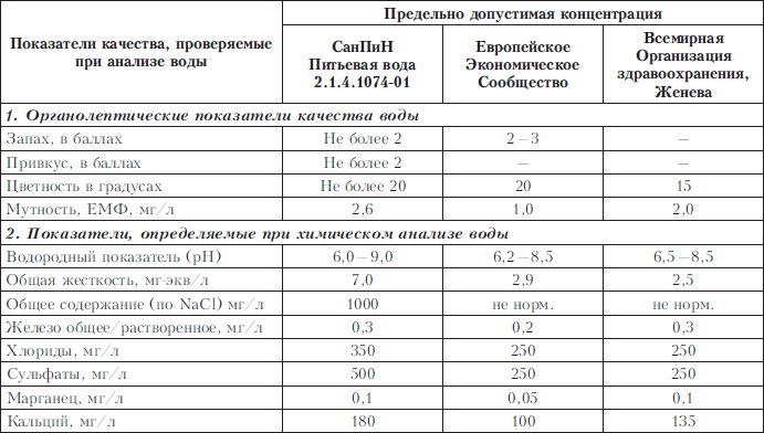 Гигиенические требования к чистоте питьевой воды централизованных систем водоснабжения определяются санитарными правилами и нормами СанПиН 2.1.4.1074-01 «Питьевая вода. Гигиенические требования к качеству воды централизованных систем питьевого водопользования». Основные требования к физическим свойствам питьевой воды: