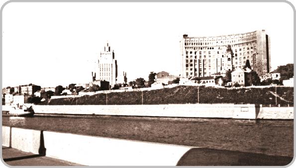 Вид на Ростовскую набережную. Слева здание МИД, справа – Дом архитекторов, на фоне которого видна колокольня Благовещенской церкви. За ним – Плющиха и Ростовские переулки. 1950-е годы. Фото из сети Интернет