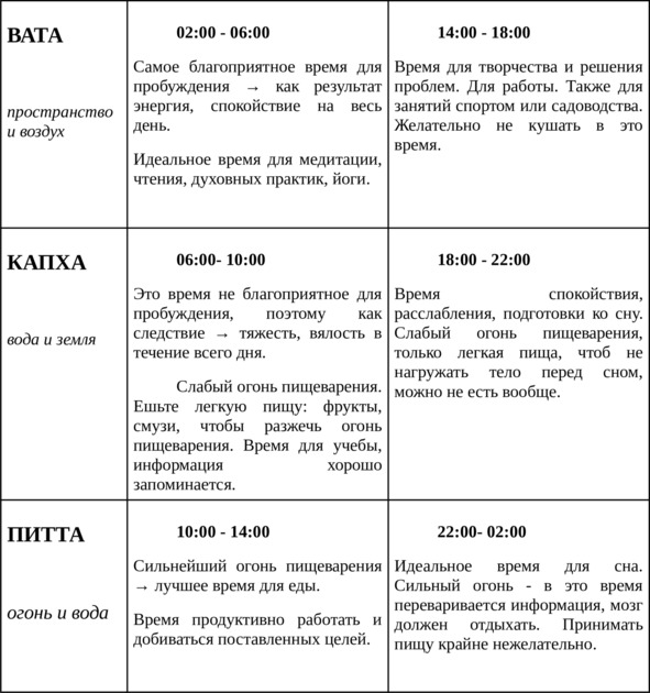 Доши оказывают на нас свое постоянное влияние с шагом в четыре часа, в течение всех 24 часов в сутки. Каждые четыре часа преобладает одна доша и оказывает влияние на общее состояние. Другими словами, есть время ваты, питты и капхи, как днем, так и ночью. Понимание этого позволяет вам выбирать занятия, пищу, которые будут поддерживать доминирующую энергию внутри и вокруг вас в это время.