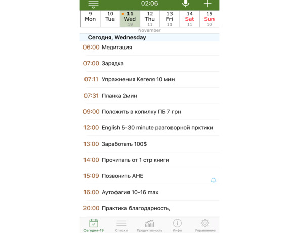Уже много лет пользуюсь приложением на телефоне «Моё время», там очень простой и удобный интерфейс: я пишу название задачи, выбираю время и дату, сохраняю – и готово. Вечером пишу задачи на следующий день. В течение дня, когда задача выполнена, отмечаю ее как завершенную. Здесь же пишу свои ежедневные ритуалы, такие как медитация, спорт и т. д. Ниже привожу снимок экрана моего приложения.