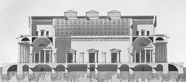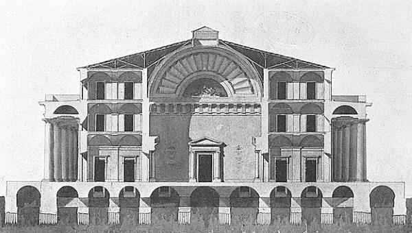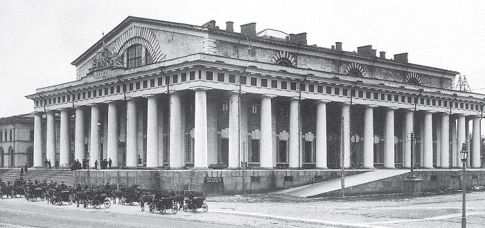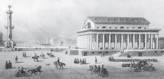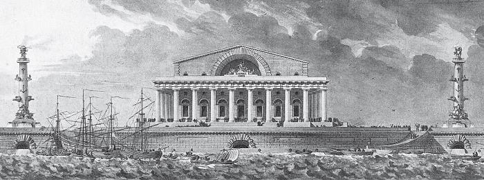 Законченное в 1816 году, здание Биржи по проекту Ж.-Ф. Тома де Томона построено в виде античного храма на высоком гранитном подиуме. Центральный объем со всех сторон окружен мощной дорической колоннадой. С торцевых сторон на подиум ведут широкие гранитные лестницы. Новое сооружение приобрело в застройке невских берегов значение важнейшего ориентира, которым замыкается панорама центра города.