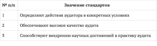 Стандарты аудита – это единые нормы и правила осуществления аудиторской деятельности. Соблюдение единых требований к порядку осуществления аудиторской деятельности, содержащихся в стандартах аудиторской деятельности, должно обеспечить аудиторским организациям и индивидуальным аудиторам желаемый конечный результат – оказание качественных аудиторских услуг.