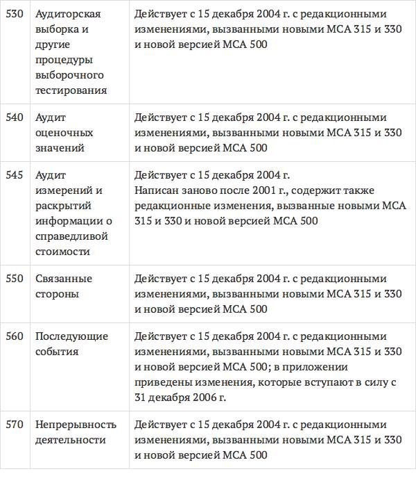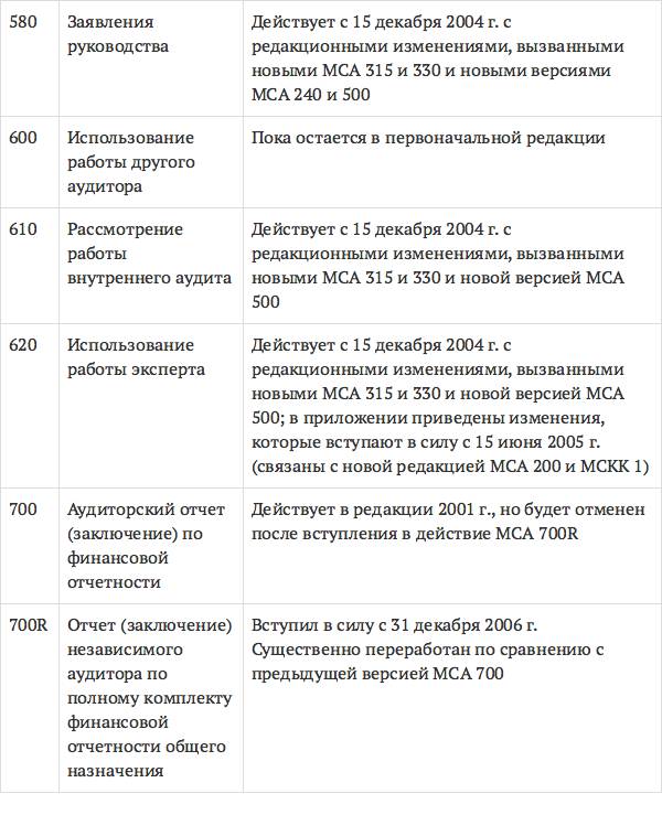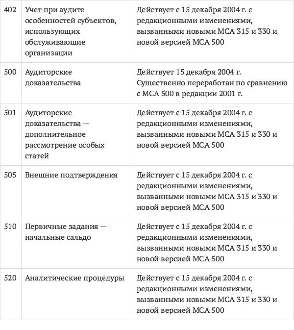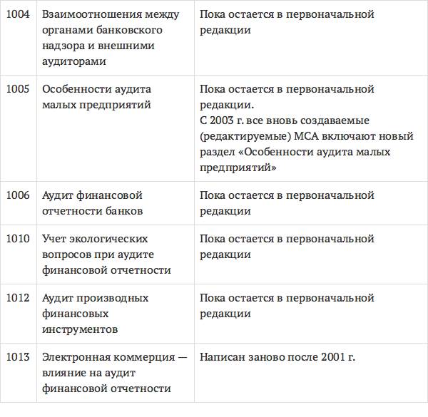 Международные стандарты аудита (МСА) являются общепризнанным механизмом регулирования существующих в мировой практике подходов к аудиту. Они призваны регулировать единство организации, порядка и оформления процедур, а также результатов аудиторской деятельности во всем мире. Однако они не отменяют существующие в ряде стран национальные стандарты.
